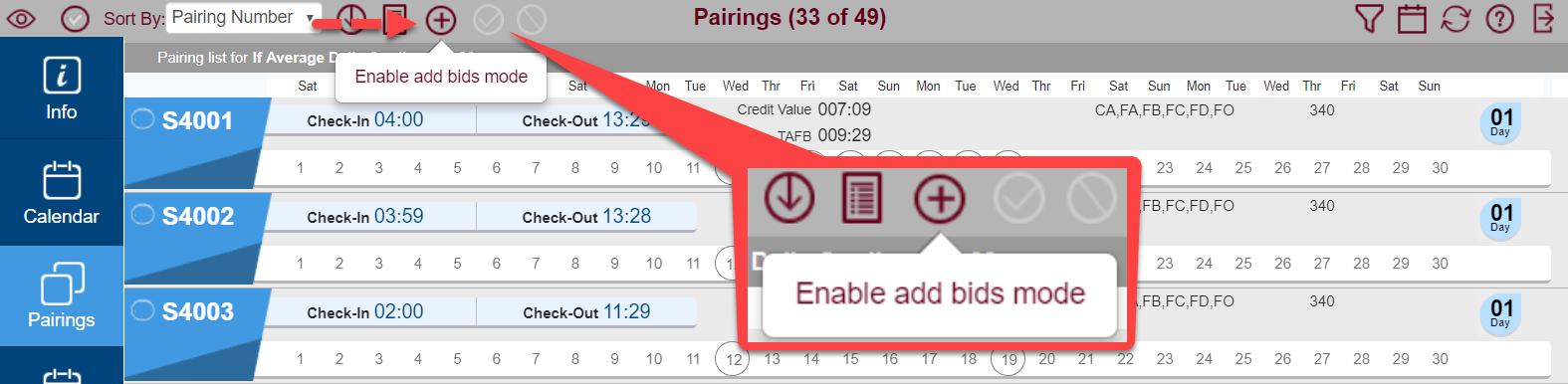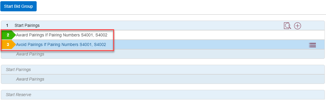 Add a Start Pairings bid group from the Bids screen. See Before You Can Add a Bid for important information before adding a bid from the Search screen.