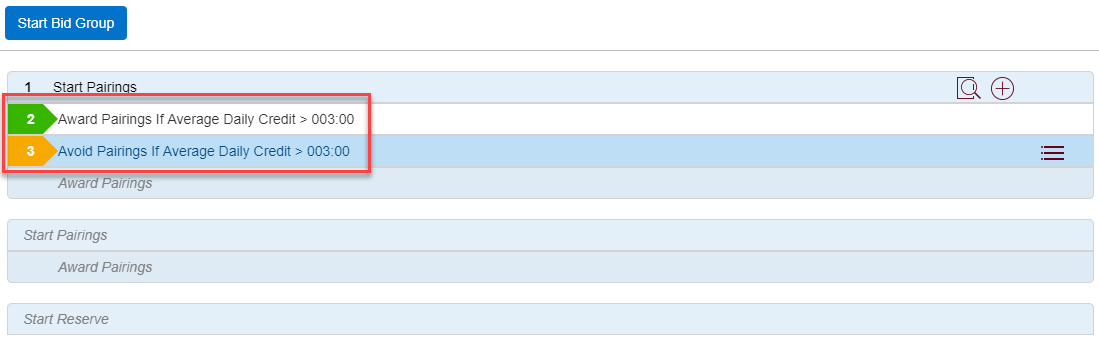 Select a bid in the Start Pairings bid group. The bid preference selected is highlighted blue. The new bid preference is added below the highlighted bid.