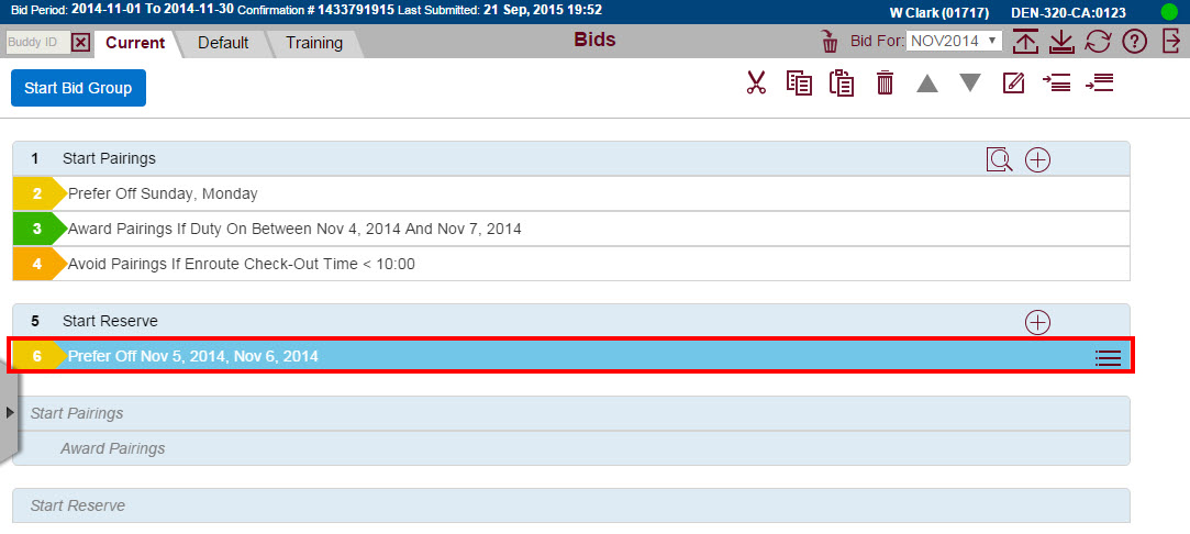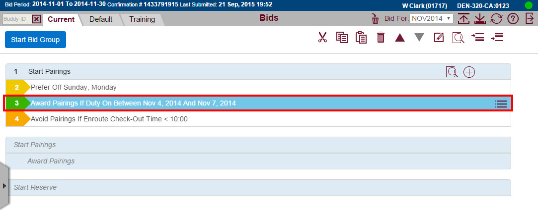 The blue highlighted bid indicates that it is the active bid group (highlighted by red box in the screenshot). Click on the bid 1, Start Pairings to highlight the entire bid group. If you have multiple Start Pairings bid groups the bid is entered in the active one below the highlighted bid.